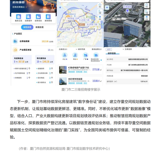 作为部城市存量国土空间现状评估数据建设试点,厦门创新采用城市国土空间监测建筑编码与不动产宗地代码“双码结合”模式,为建筑赋予唯一“数字身份证”,形成了打通了规划管理全生命周期数据链路,覆盖626.32平方公里、包含28.55万栋建筑的数据成果。同时,在国土空间详细规划监测评估预警、城市更新潜力评估、存量楼宇招商三大应用场景中,充分释放数据要素价值,为各类应用场景提供了坚实的存量空间数据底板。