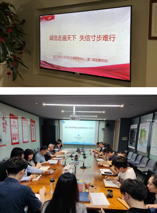 多年来,市国土交研中心通过对党员活动室及中心宣传墙的宣传内容进行持续宣传更新、多次面向中心员工开展《厦门经济特区社会信用条例》学习会议等方式持续开展诚信宣传活动。旨在通过学习会议增强职工信用意识,普及了与市场经济和现代治理相适应的诚信理念、规则意识、契约精神。持续强化行业自律,深化诚信教育,进一步提升职工的社会责任感,落实单位的时代担当,以高质量研究成果与优质展陈服务,努力为厦门经济特区社会信用建设做出应有的贡献。