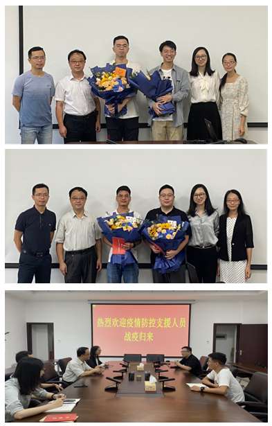 10月18日、20日,数字中心召开支援疫情防控人员战“疫”归来座谈会,中心主任张晓宏、总工程师、工会主席陈彪、人事部门负责人及党支部班子代表参加了座谈会,对在此次支援防疫一线的林同舟、张斌贵、李港、曾彧佶战“疫”归来表示欢迎及真诚的感谢,并为他们献上鲜花。新冠肺炎疫情发生后,中心林同舟、张斌贵、李港、曾彧佶无畏艰难,主动报名,逆行而上,毅然奔赴同安区、海沧区,支援疫情防控工作,持续坚守近一个月,直至疫情结束。张晓宏主任对支援疫线的四人圆满完成任务平安归来表示欢迎,充分肯定了他们主动支援防疫一线的担当及在防疫工作中的出色表现,对他们的辛勤付出表示感谢。返回工作岗位的他们纷纷表示,能够为疫情贡献一点力量是他们的骄傲,这将是他们一段难忘的记忆,回来后将迅速调整好状态,以更加昂扬的斗志投入到今后的工作中,为资源规划信息化事业作出更大的贡献!(数字中心 王林凤)