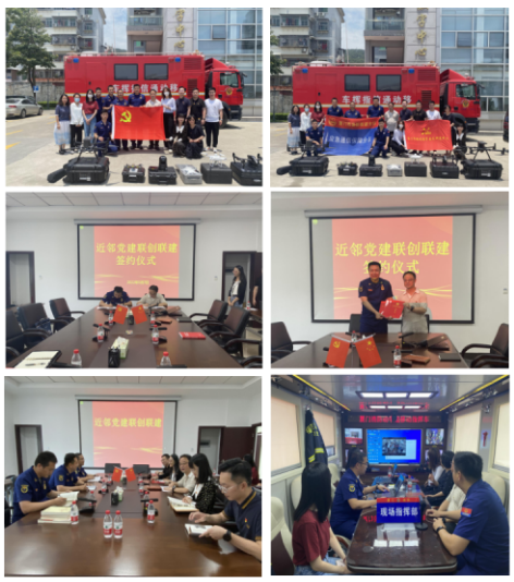 在签订联建协议后,双方结合各自党支部基本情况进行了深入的座谈交流并开展党建读书会,通过阅读、分享党史经典书籍,厚植爱党、爱国情感,从书中汲取力量,鼓舞斗志。随后,中心组织党员参观了消防移动通信指挥车,了解了无人机航测建模技术在应急救援指挥中的应用。