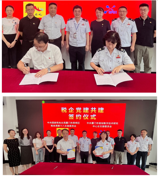 9月23日,数字中心党总支与厦门市思明区税务局第十八党支部签订税企党建共建协议书,共绘党组织共建发展蓝图。厦门市自然资源和规划局机关党委专职副书记张建新,思明区税务局党委书记、局长、督办张翼,思明区筼筜街道党工委书记黄彦旎,思明区税务局筼筜税务所党支部书记、所长、四级高级主办吴真宝,数字中心党总支书记、主任张晓宏等领导及相关党员干部共同参加了此次活动。